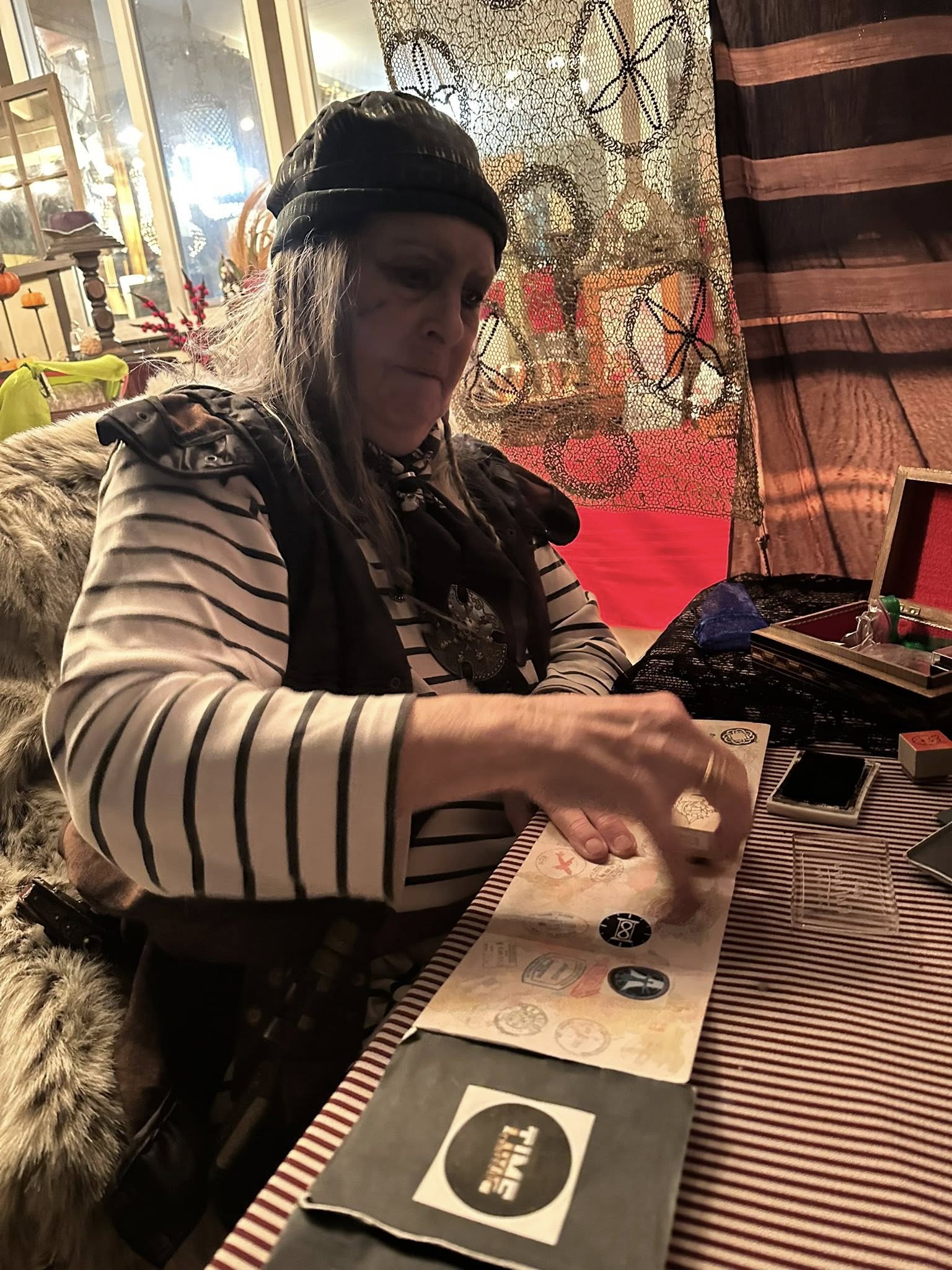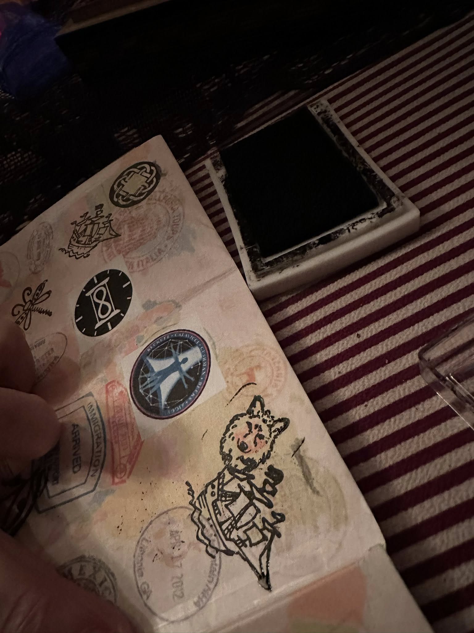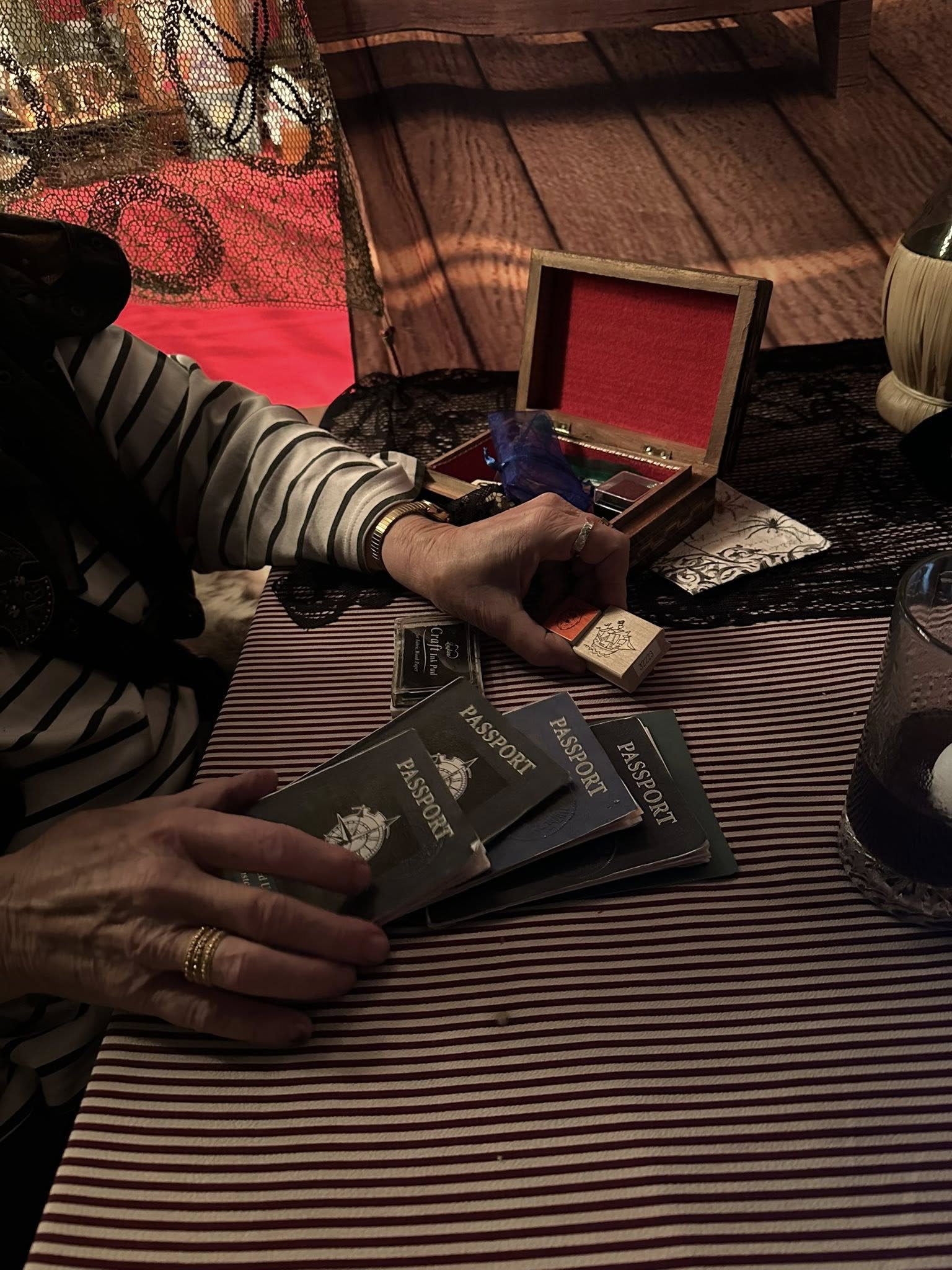 Bahira carefully scrutinizes then stamps all temporal passports. Paperwork is very serious business.