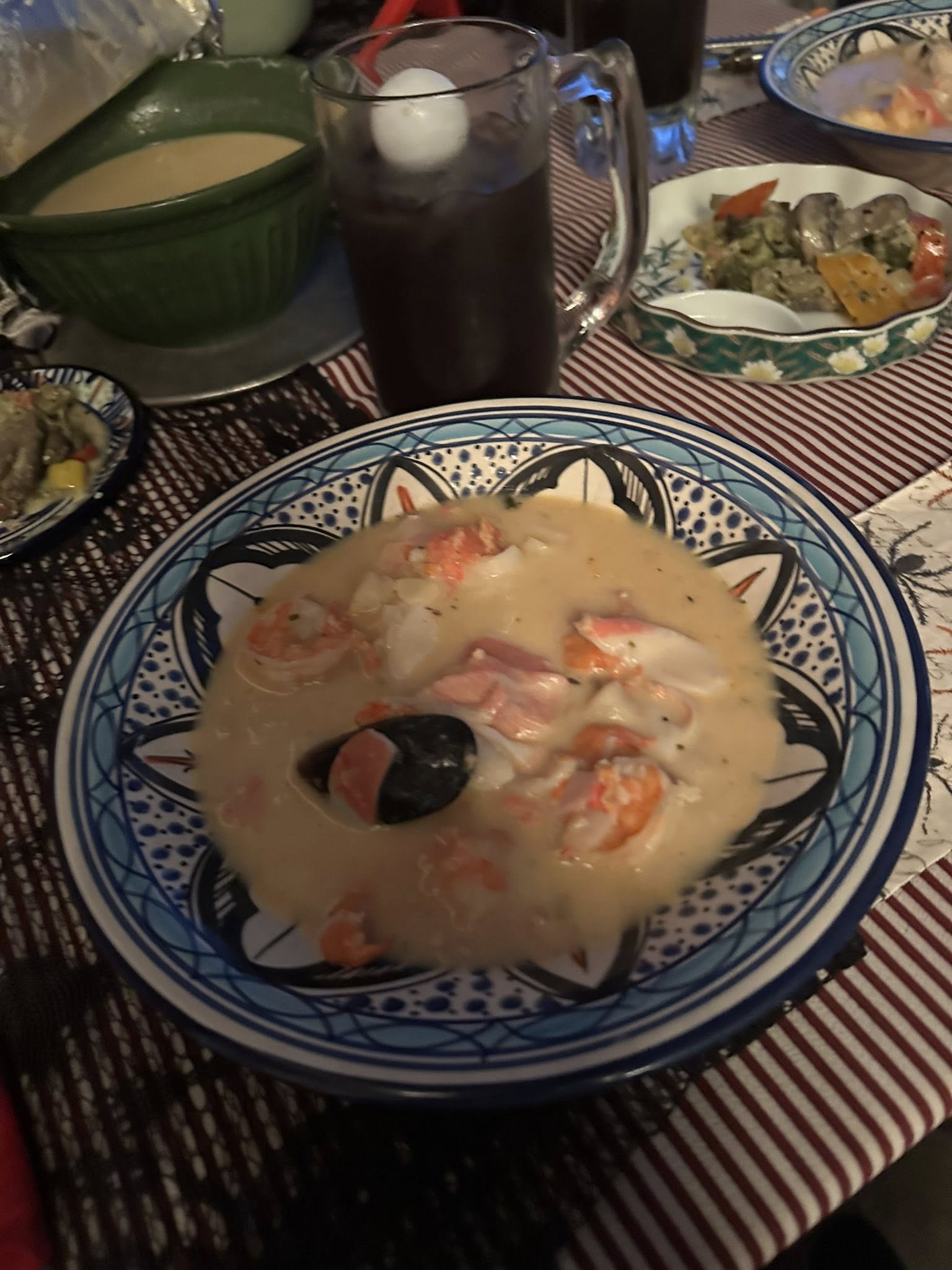 Creamy Seafood Stew! Mussels, crab, lobster, shrimp with sautéed veggies on the side.