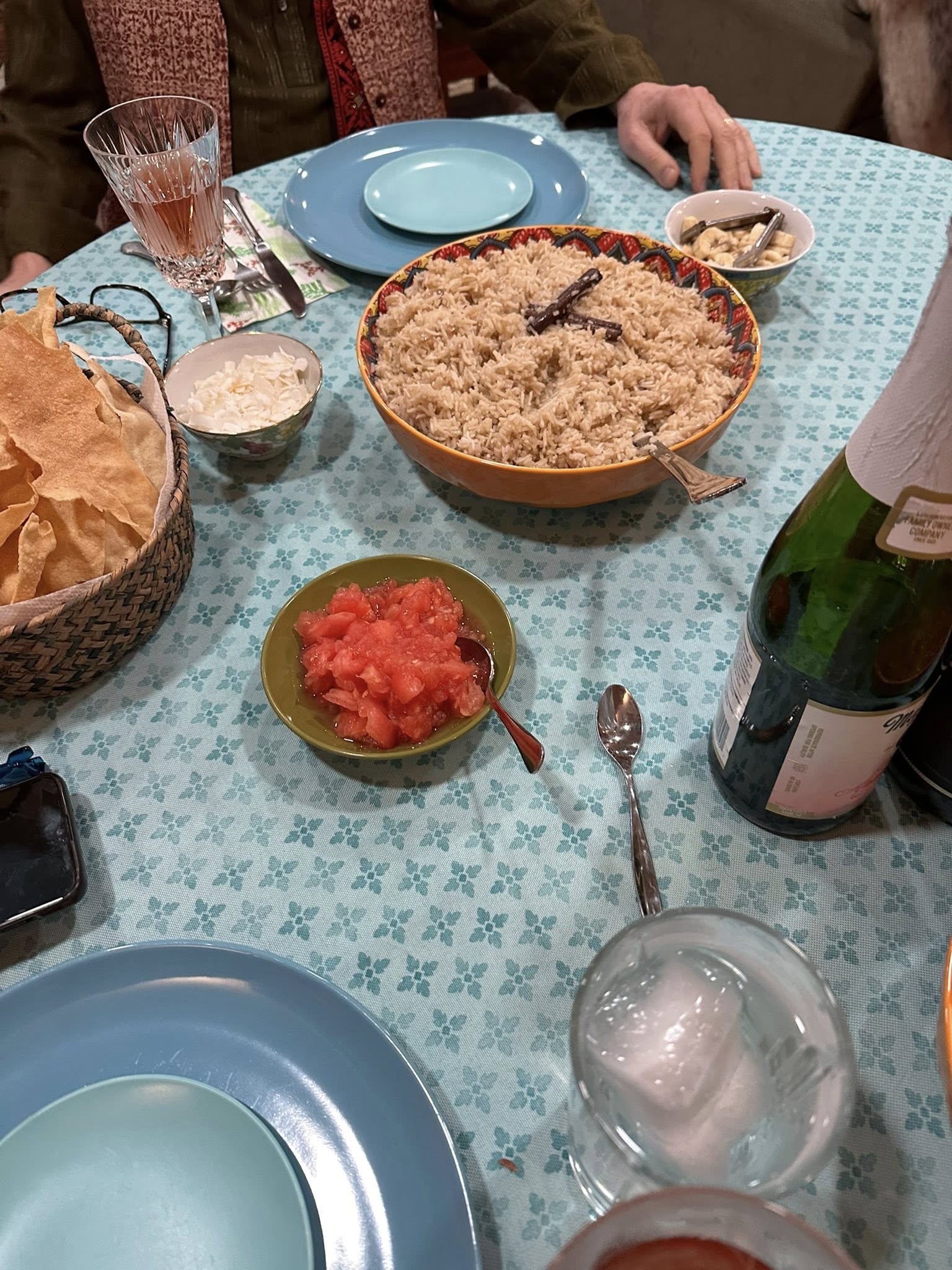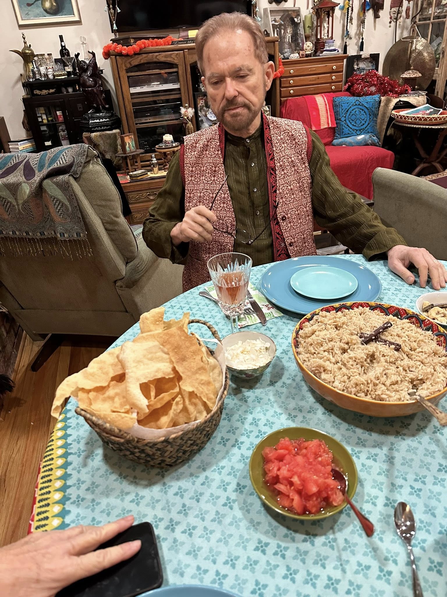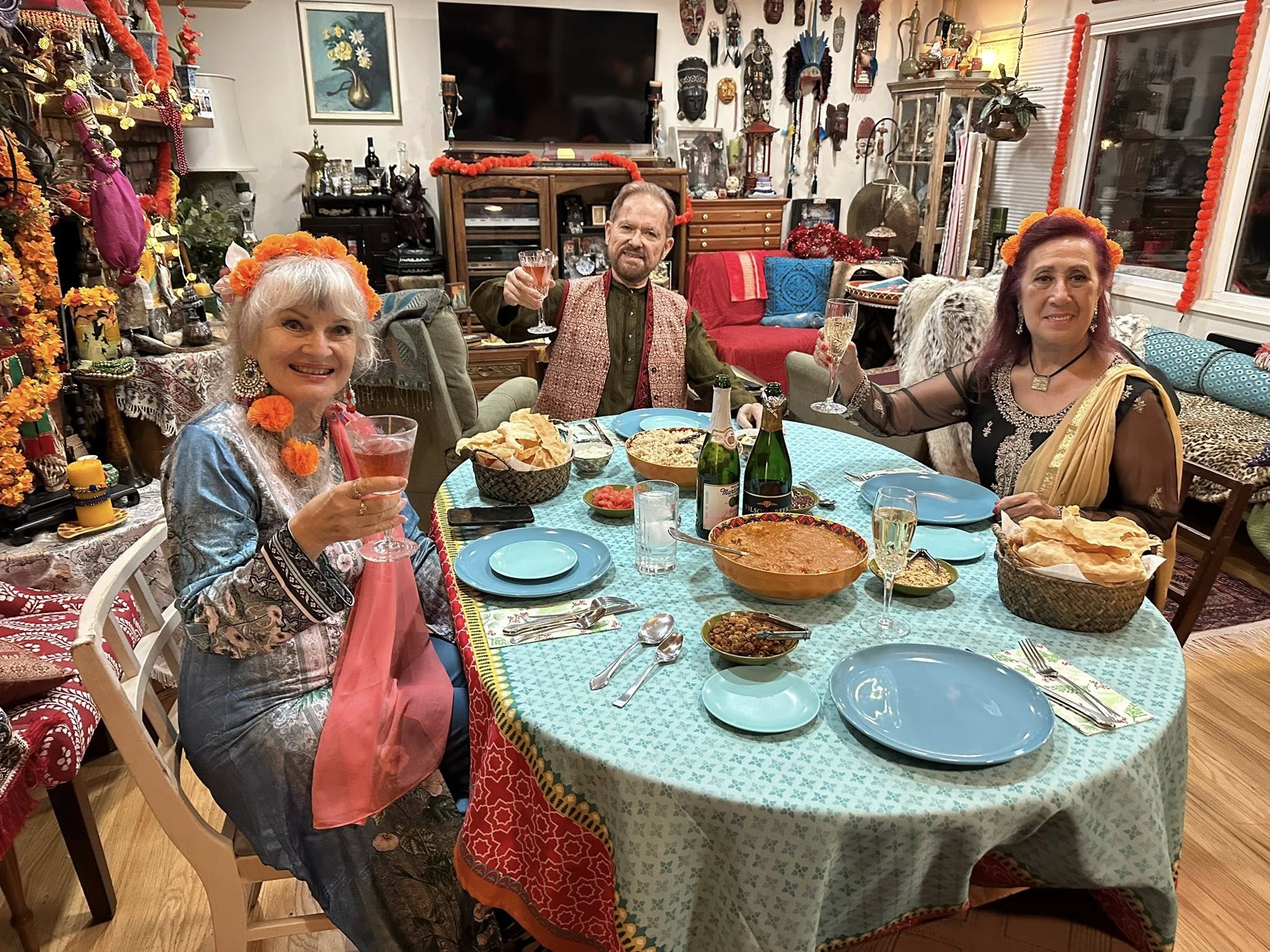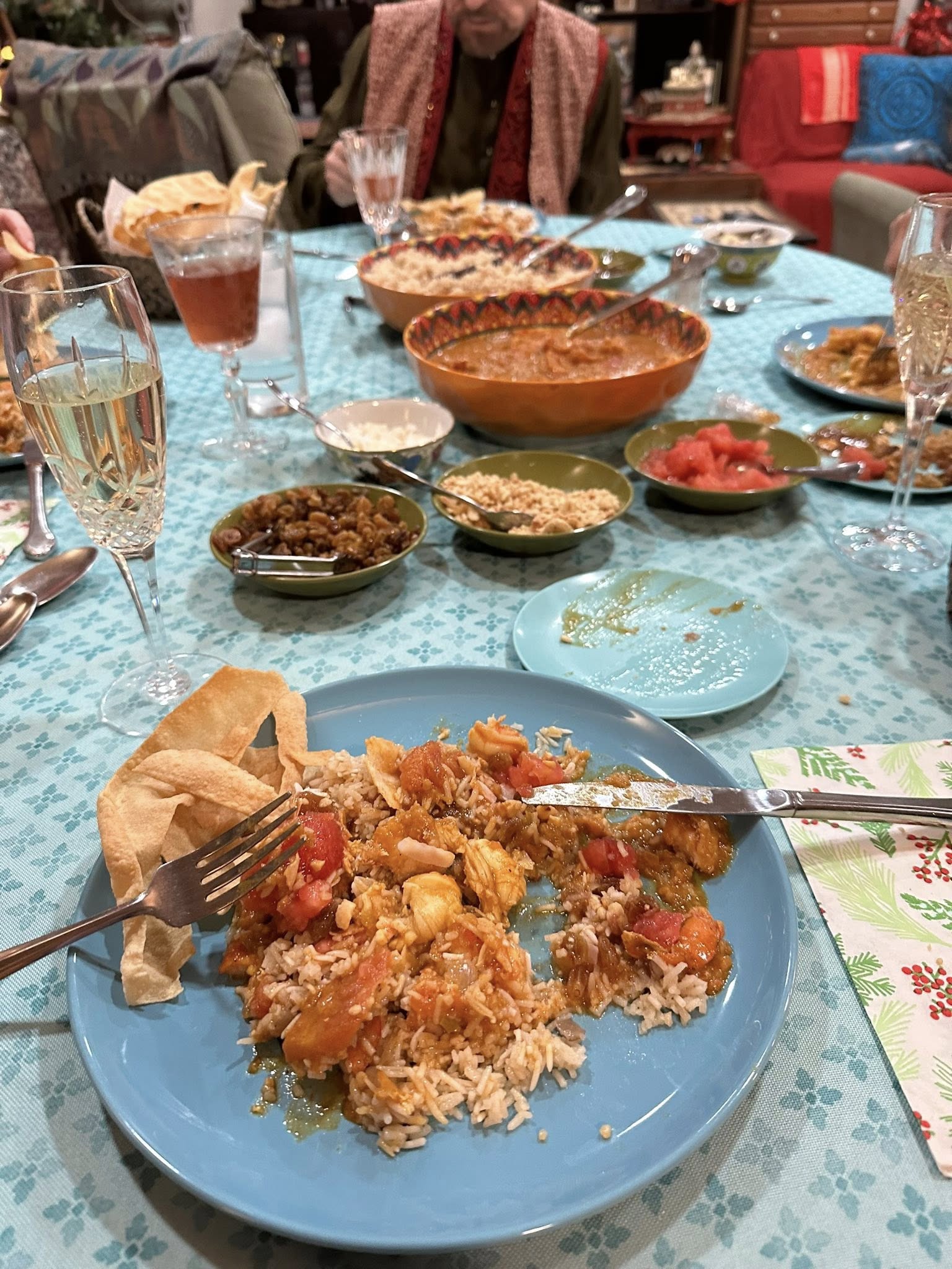 Part 3: The Best Exotic Marigold Hotel New Years Eve 2025. Dinner!! Chef Bahira was very fortunate to obtain an authentic recipe from her Aunt Gloria’s Indian Cook from their days abroad: Shrimp (and lobster) Curry with Basmati Rice and fresh Poppadoms and sides of Go-Withs: Peanuts, Raisins, Coconut, Chutney, Tomatoes.