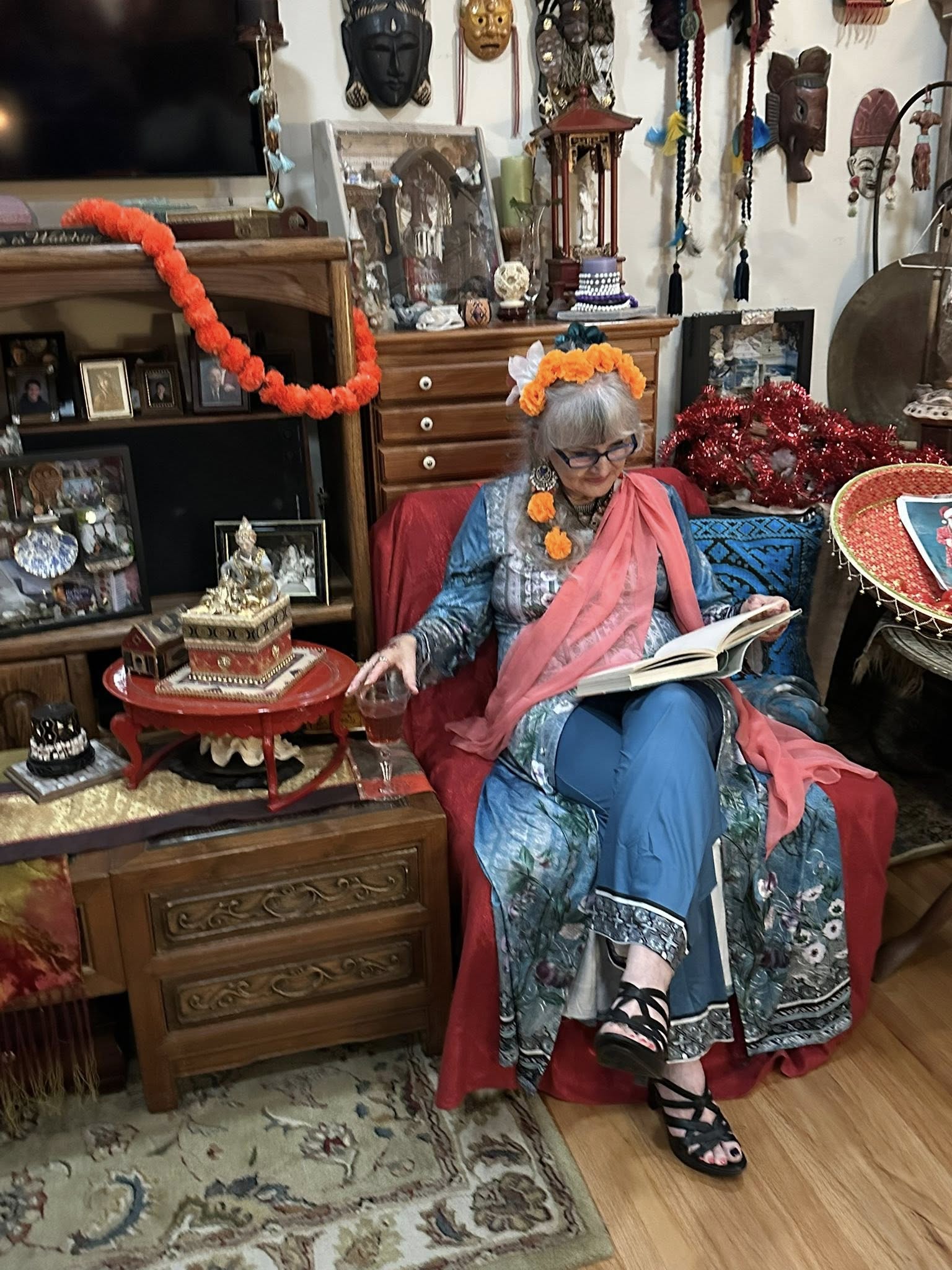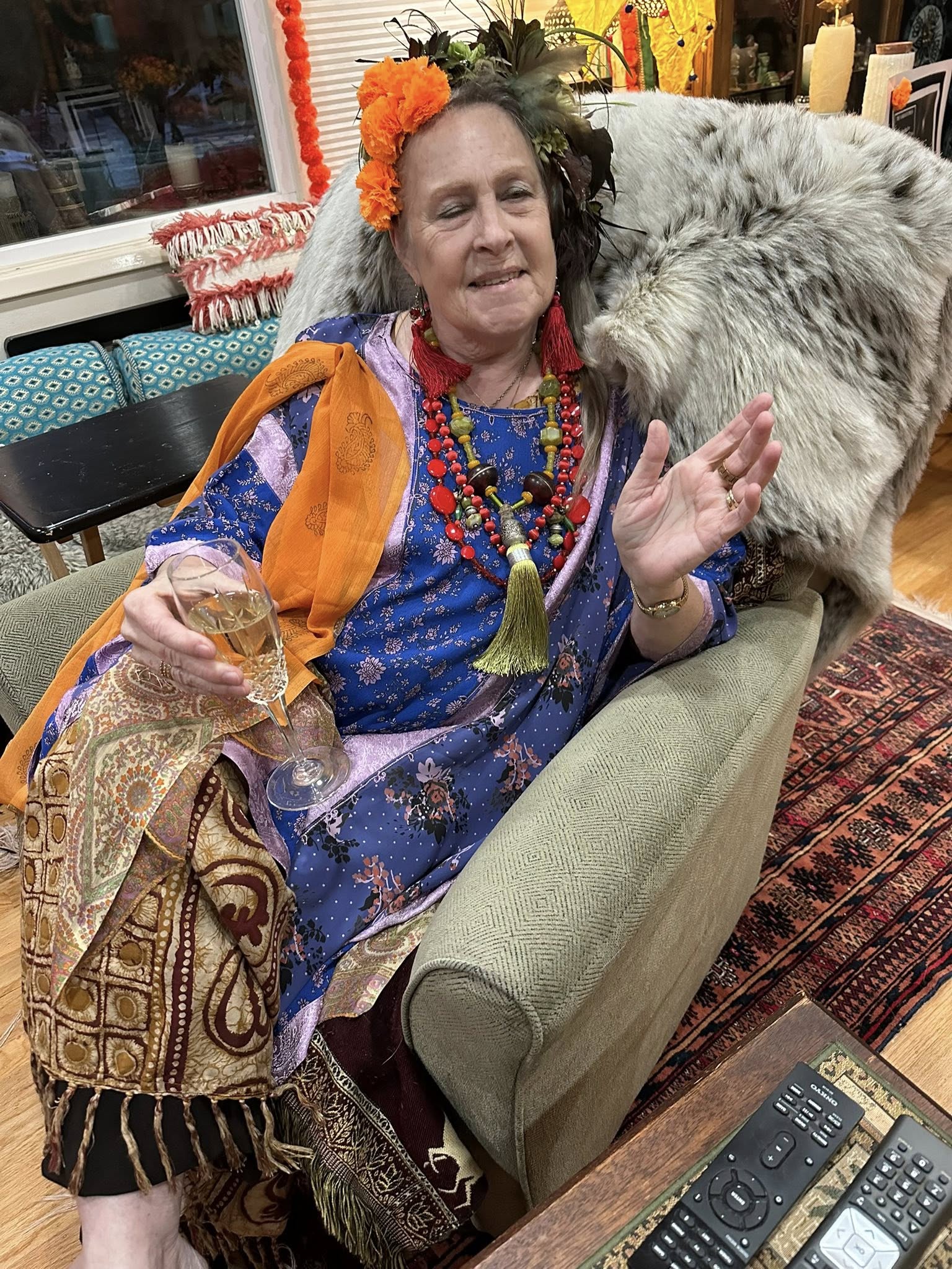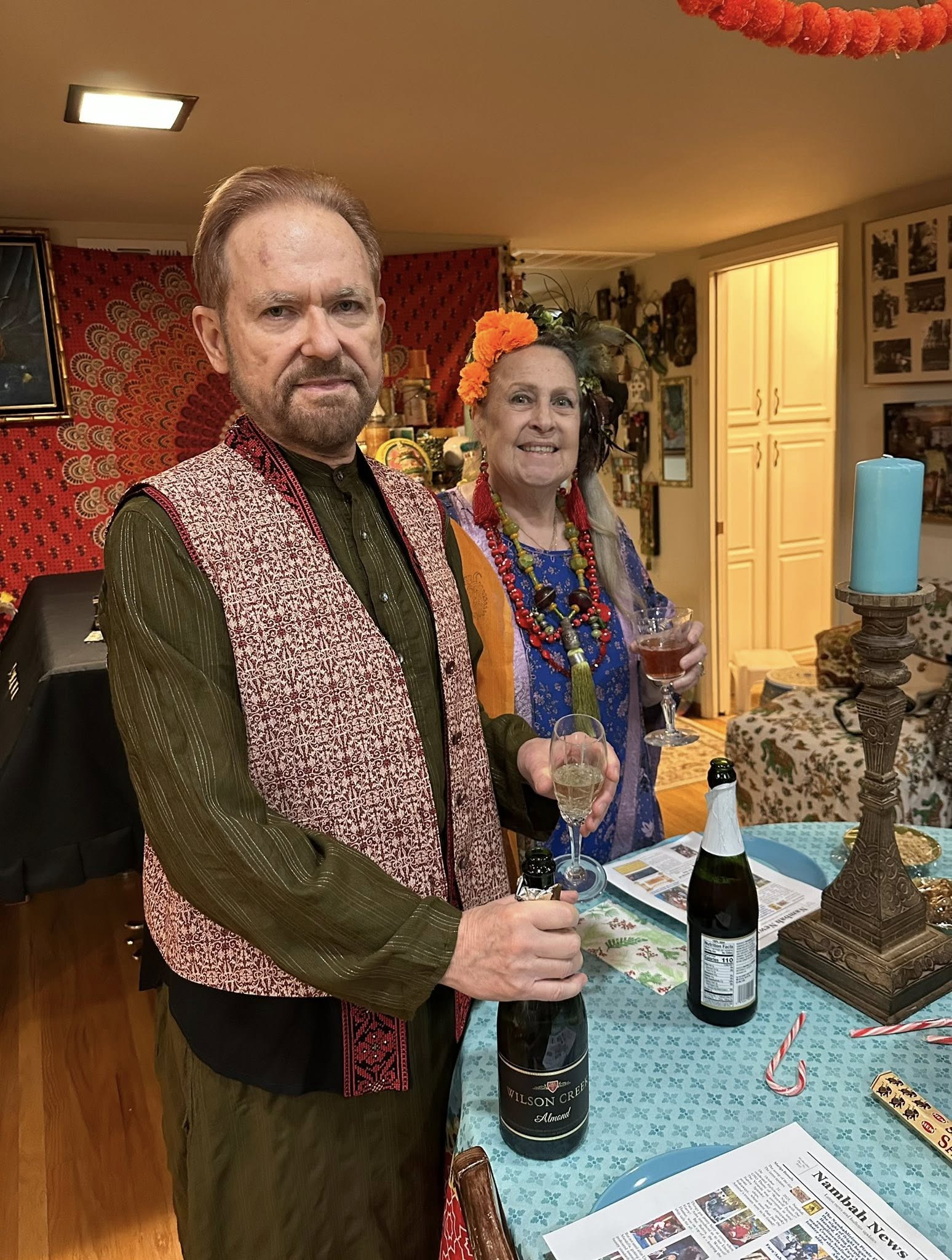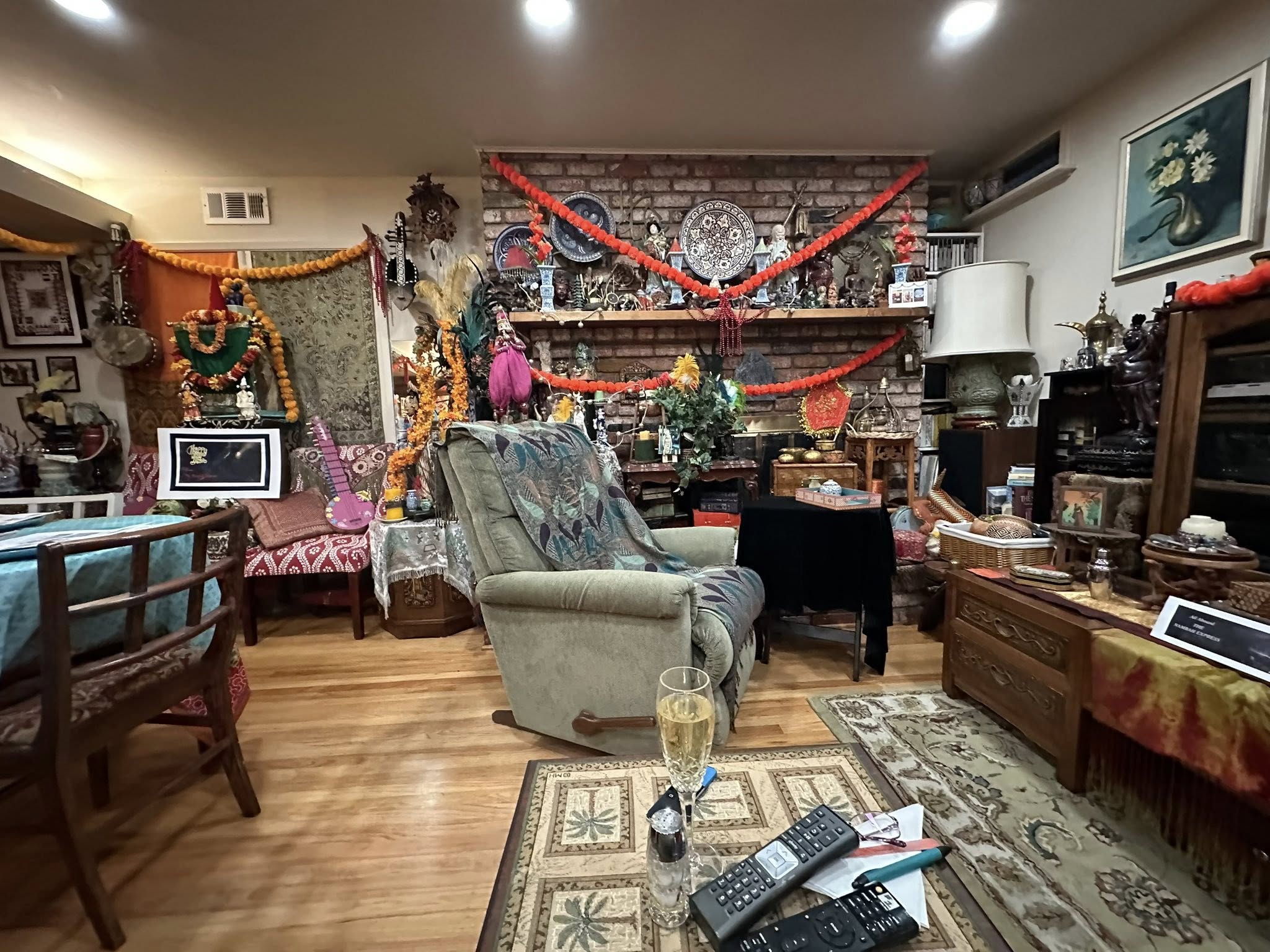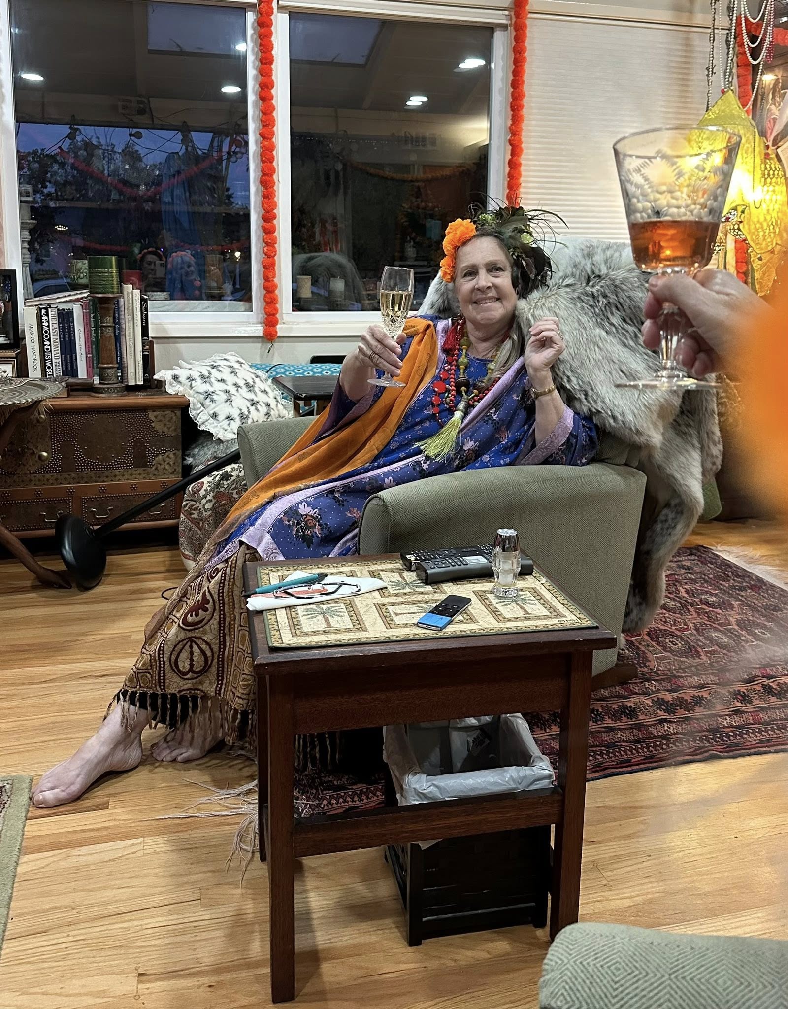 Part 3: The Best Exotic Marigold Hotel New Years Eve 2025. Dinner!! Chef Bahira was very fortunate to obtain an authentic recipe from her Aunt Gloria’s Indian Cook from their days abroad: Shrimp (and lobster) Curry with Basmati Rice and fresh Poppadoms and sides of Go-Withs: Peanuts, Raisins, Coconut, Chutney, Tomatoes.