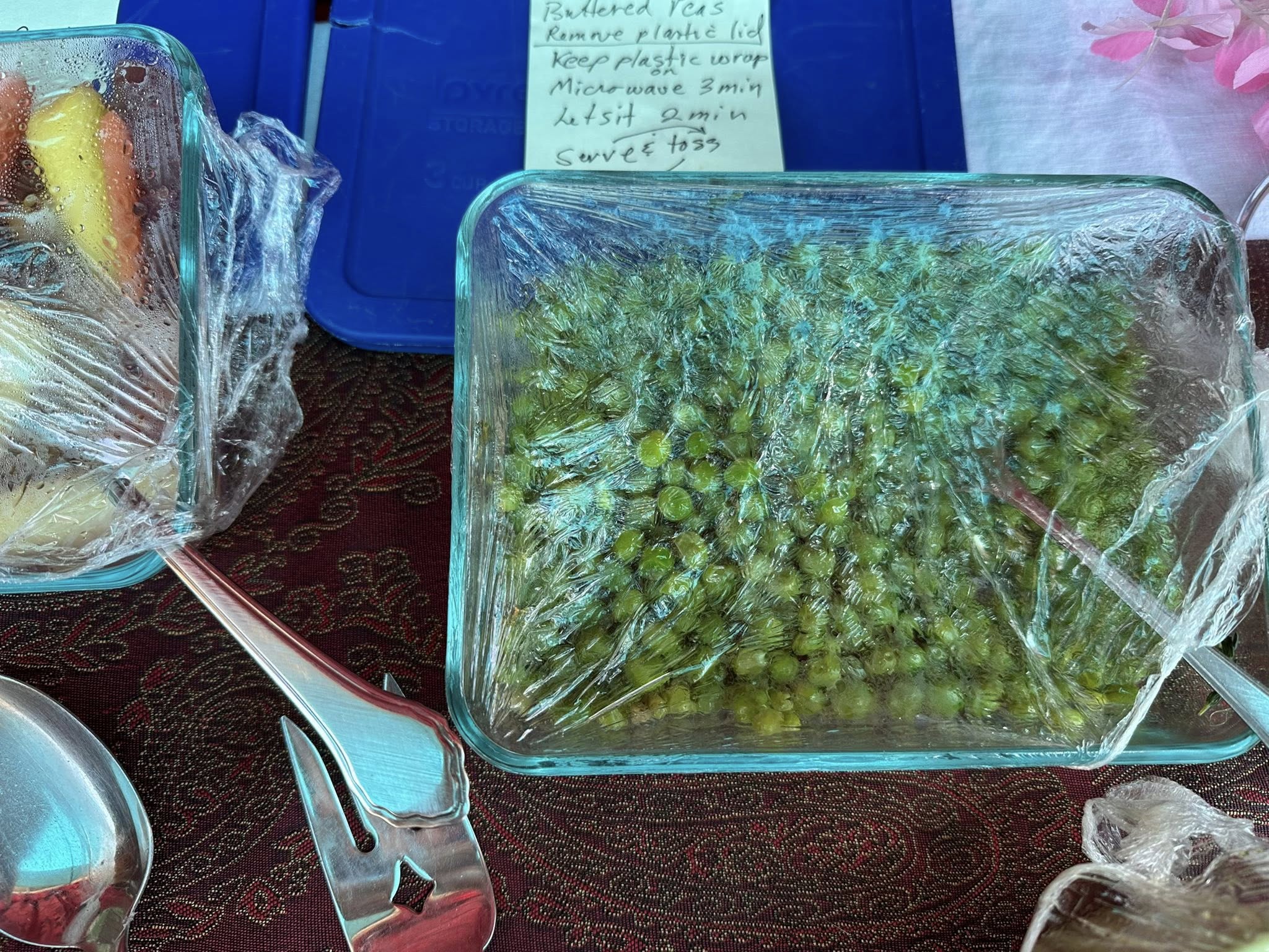 Salad & dressing. Peas with butter. Creamed baby spuds.
